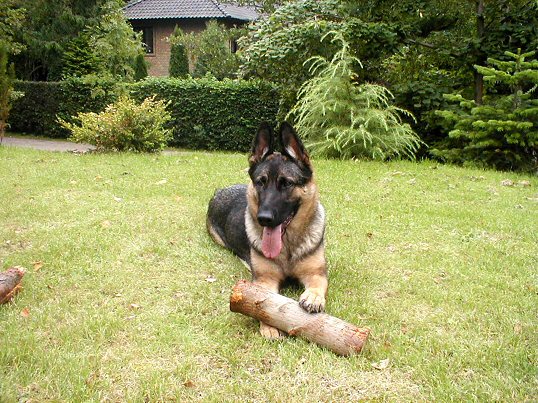 Sallie med tandstik i haven